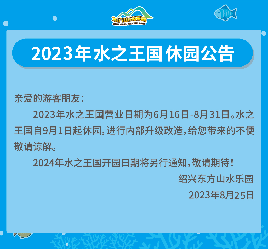山之王国时间 9:30-16:30 水之王国时间 9月1日起休园,明年夏天再见 酷玩王国时间 10:00-16:30