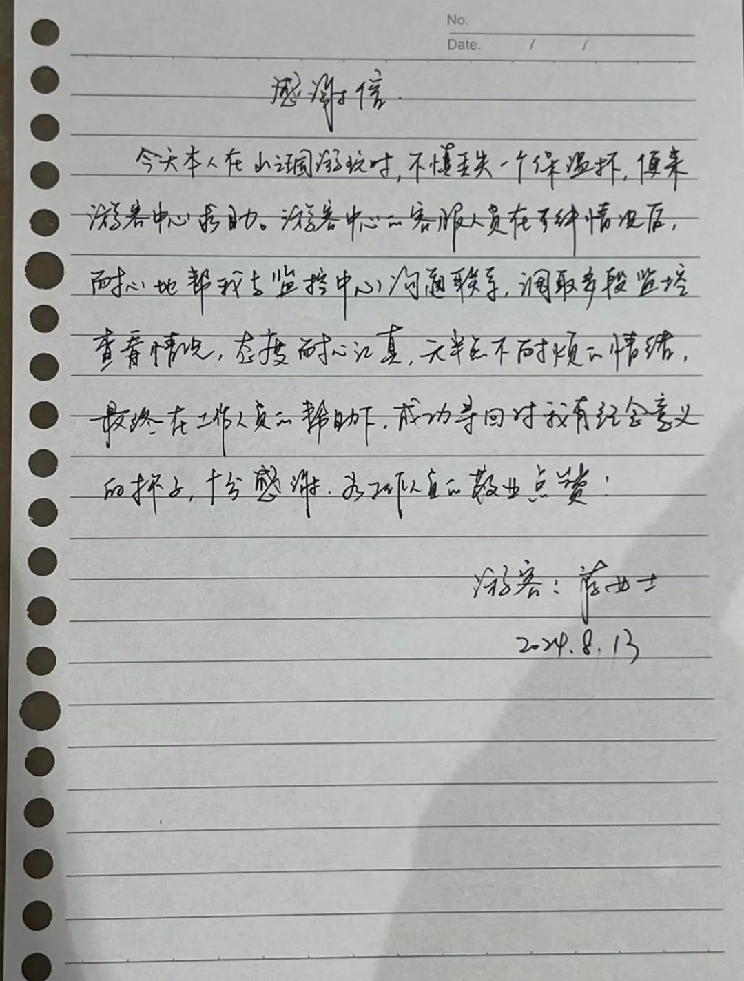 8月13日,一位游客因丢失极具纪念意义的保温杯而求助于客服,客服人员急客人所急,第一时间通过查监控、广播播报等方式帮助寻找,最终帮其成功找回,此举深受游客赞许,还特意写下感谢信表达谢意。